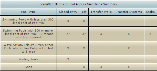* Requires two means of access. Primary means must be by sloped entry or pool lift; secondary means can be any of the permitted types.